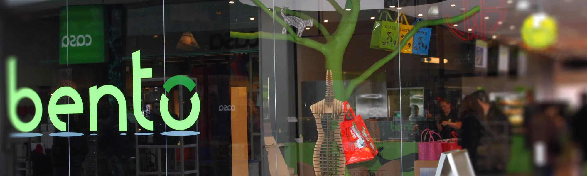 Identité visuelle et éléments visuels pour Bento, un concept store et snack street-food healthy à Belle-Ile Liège, sur un modèle du type Exki.