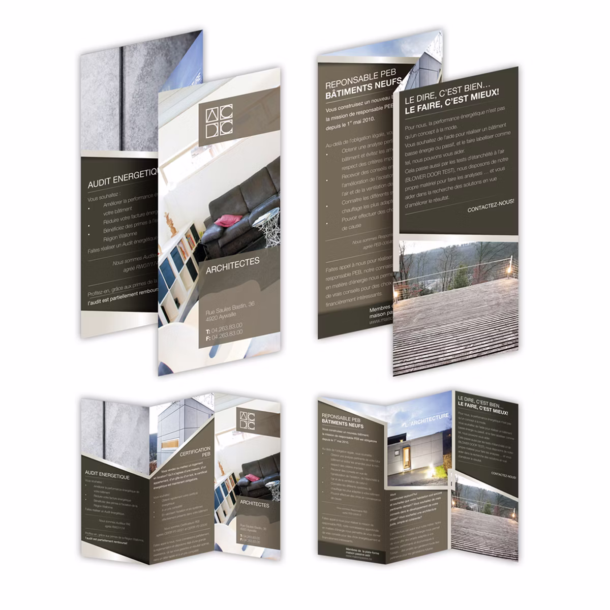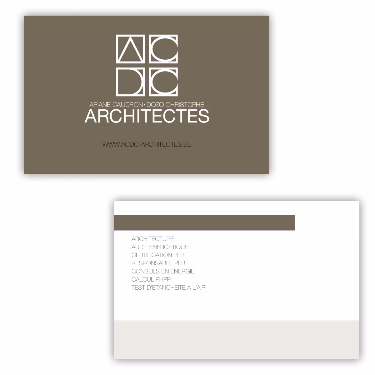 Identité visuelle et éléments de papeterie pour ACDC Architectes, un bureau d’architecture basé à Aywaille. Le travail graphique comprend un logo, une carte de visite, un papier à en-tête, des panneaux pour un stand et un panneau de chantier.