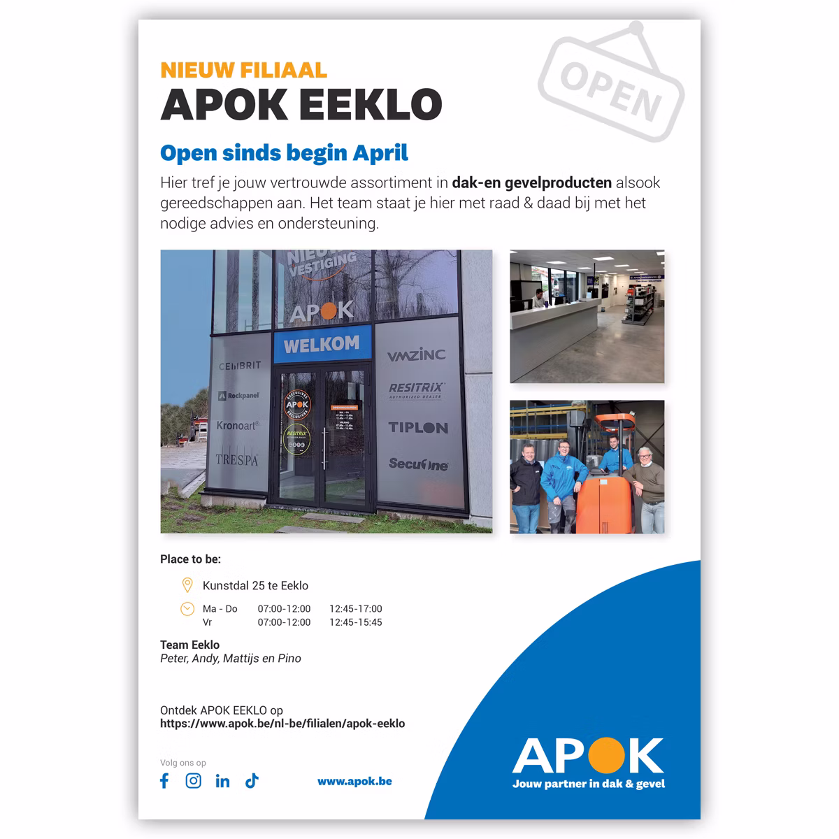 Fondée il y a plus de 60 ans, la société belge APOK offre au spécialiste des toitures et des façades un ensemble complet de produits et de services, dans leurs agences et en ligne. Avec pas moins de 33 agences, ils sont numéro un du marché des matériaux pour toitures et façades en Belgique.